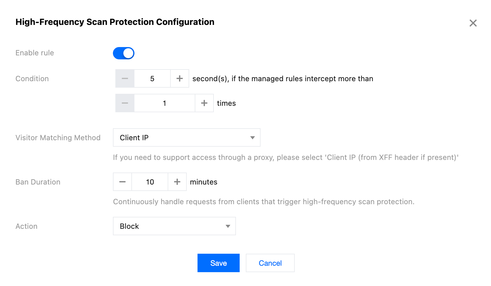 Note 1: High-Frequency Scan Protection only counts requests matching the rules configured as block. Requests matching the rules configured as observation mode are not counted.
