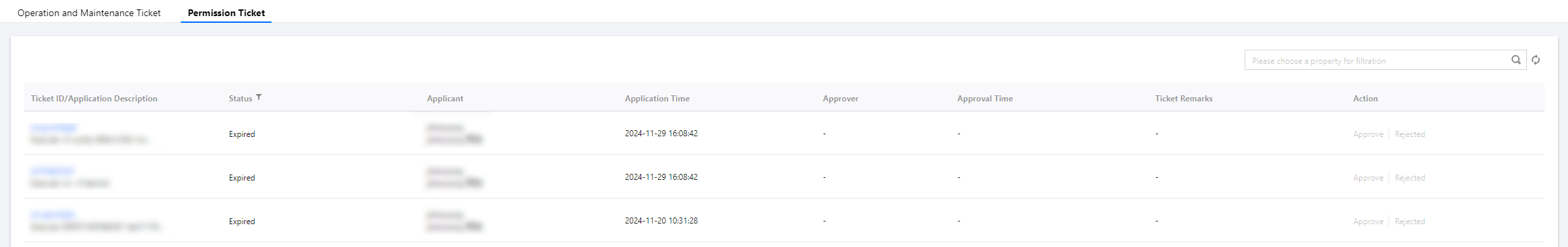 3. On the Permission Ticket page, detailed records include the ticket ID/application description, ticket status, applicant, application time, approver, approval time, and ticket remarks.