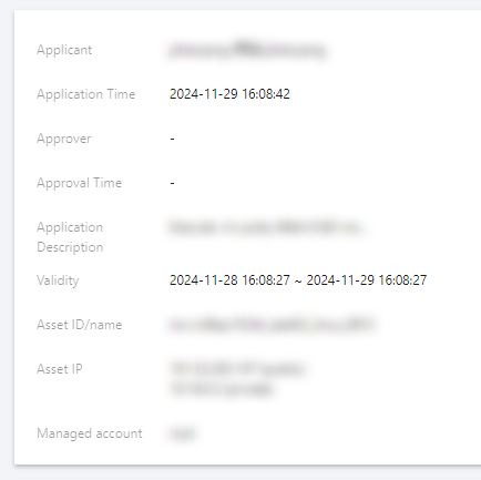 2. On the Ticket Details page, detailed records include the applicant, application time, application description, asset ID/name, and asset account.
