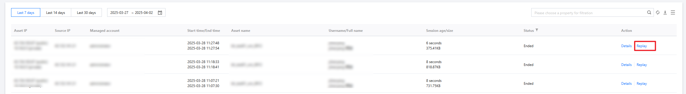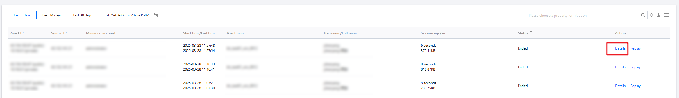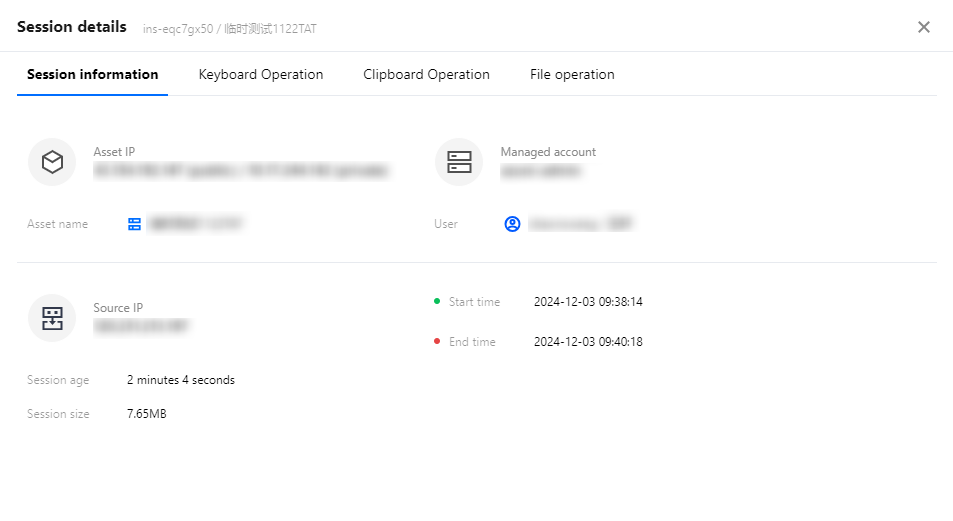 4. On the Screen recording page, click Details on the right side of the corresponding session to open the Session Details page. 5. On the Session details page, you can view the session's basic information, keyboard operations, clipboard operations, and file operation records.