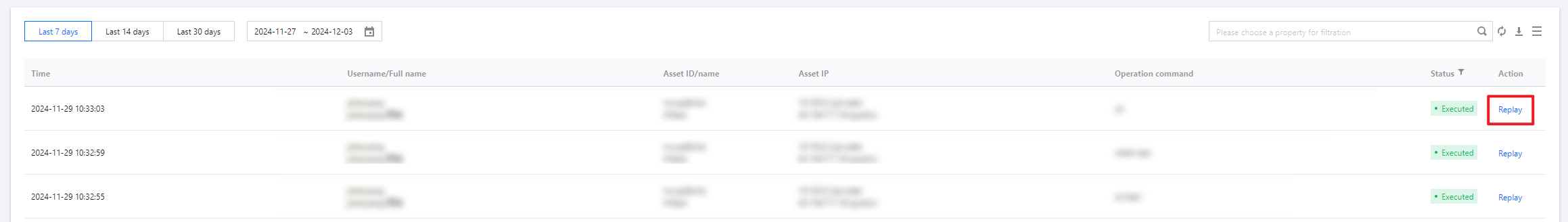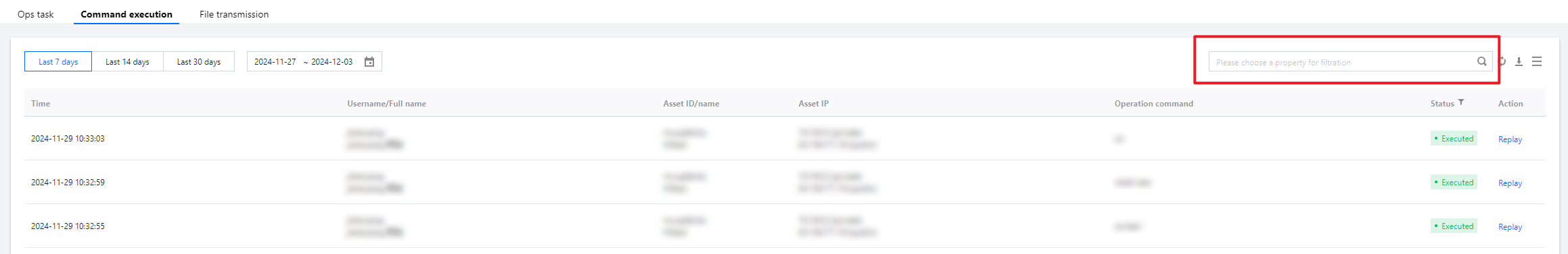 4. On the Command execution page, view the commands executed by Ops personnel, or click the icon to search. 5. On the Command execution page, click Replay to view the specific command execution details.