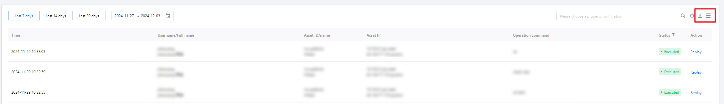 1. On the Command Execution page, download the retrieved command execution operations by clicking the in the top right corner of the list. 2. After the download is complete, click to go to the download task list and export the document to the local machine.