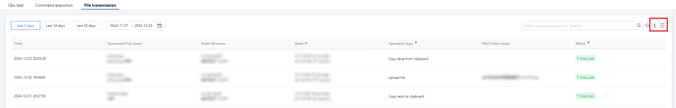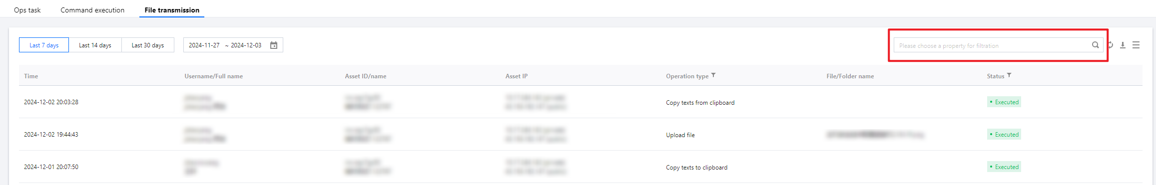 4. On the File transmission page, view the file transmission operations performed by Ops personnel, or click the icon to search. Downloading and Exporting