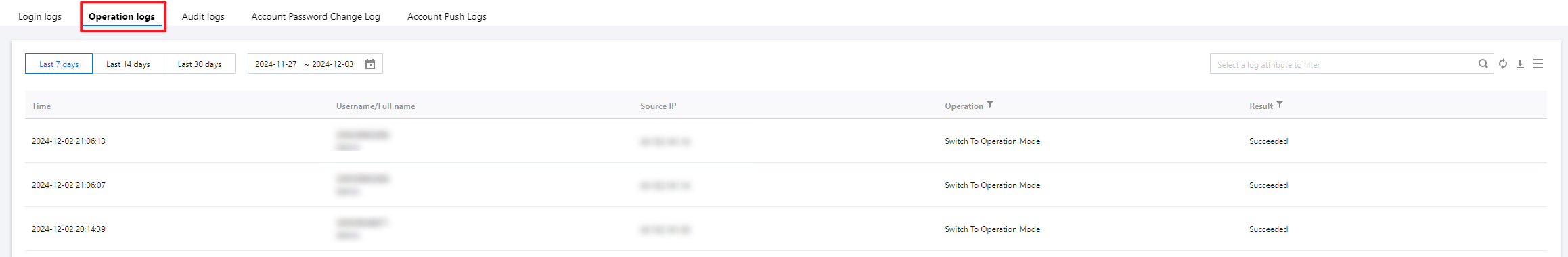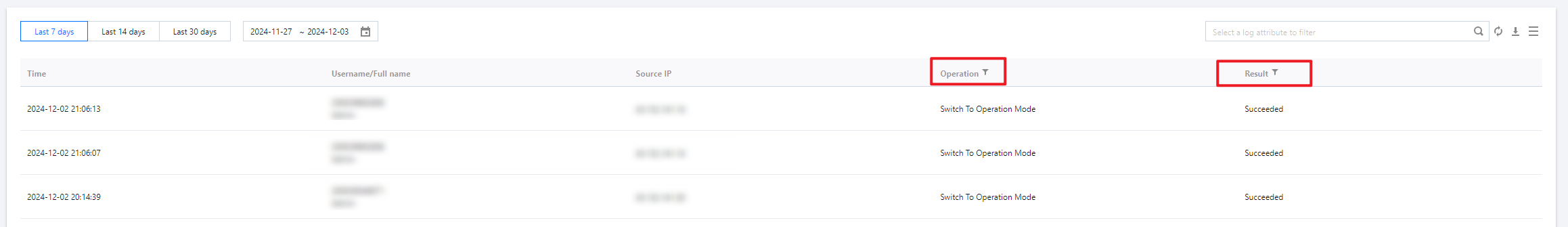 In the search box, filter logs by attributes such as username, name, or source IP. Click to quickly query operation logs. On the Operation logs page, search for specific operation logs using Operation and Result.