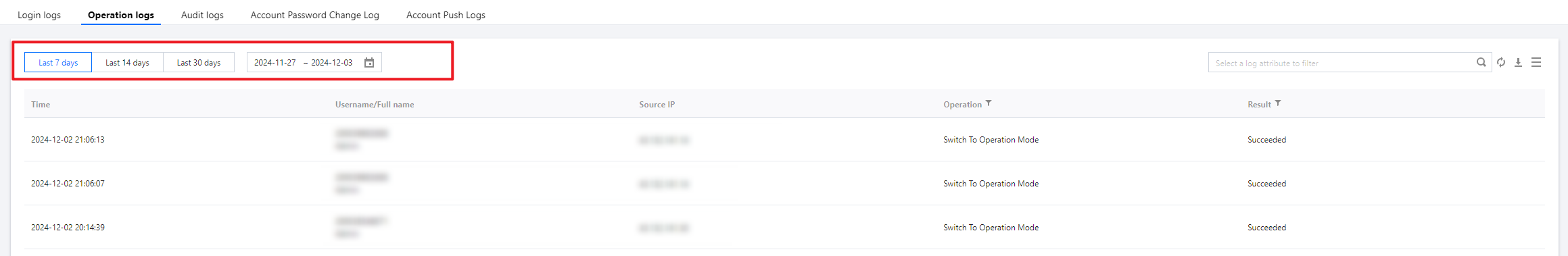 On the Operation Logs page, you can click Time to switch and view operation records for different time periods.