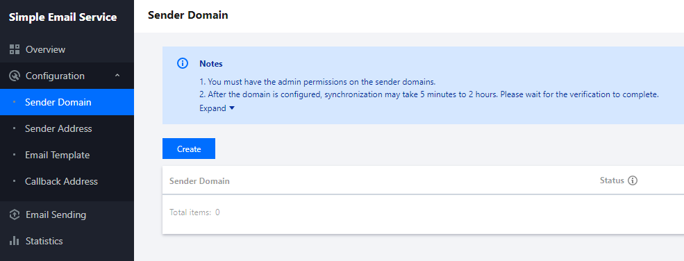 Status | Verifikasi tertunda: domain harus lulus verifikasi sebelum dapat digunakan untuk mengirim email. Terverifikasi: domain telah diverifikasi dan dapat digunakan untuk mengirim email. |