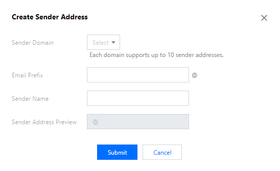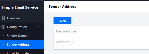 1. Login ke konsol SES, klik Configuration (Konfigurasi) > Sender Address (Alamat Pengirim) untuk membuka halaman Sender Address (Alamat Pengirim), dan klik Create (Buat). 2. Di kotak dialog Create Sender Address (Buat Alamat Pengirim), pilih domain pengirim, masukkan awalan email dan nama pengirim, lalu klik Submit (Kirim) untuk menyelesaikan konfigurasi.