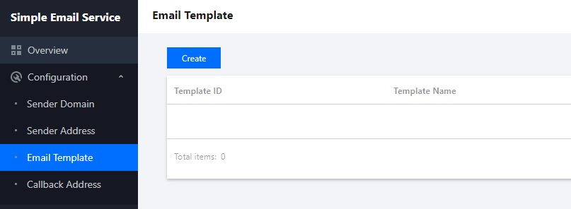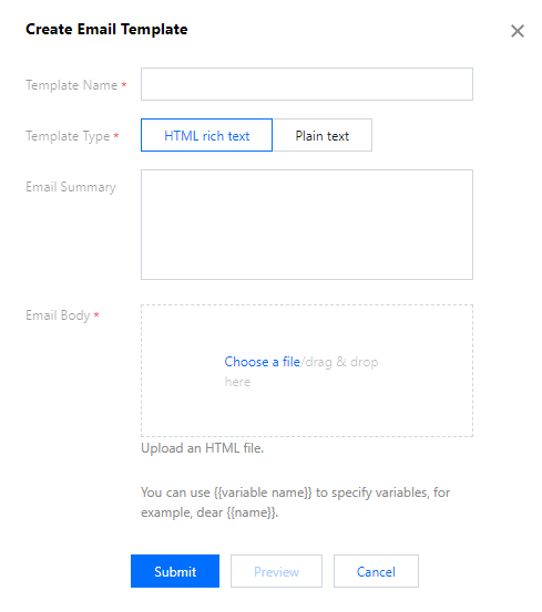 1. Login ke konsol SES, klik Configuration (Konfigurasi) > Email Template (Templat Email) untuk membuka halaman Email Template (Templat Email), dan klik Create (Buat). 2. Di kotak dialog Create Email Template (Buat Templat Email), masukkan nama templat, pilih jenis templat, unggah badan email, klik Preview (Pratinjau) untuk melihat templat, lalu klik Submit (Kirim) untuk menyelesaikan konfigurasi.