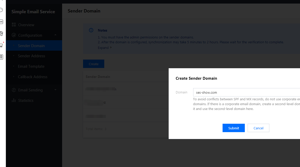 6. Kembali ke halaman detail konfigurasi Domain Pengirim dan klik Submit (Kirim). 1. Pada halaman konfigurasi Domain Pengirim, klik Create (Buat), masukkan nama domain, lalu kirim. Keterangan: