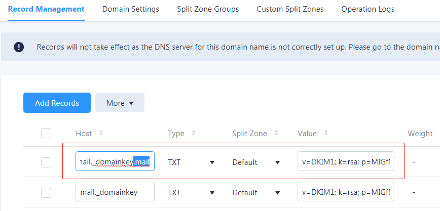 5. Tempel alamat domain pengirim di langkah 3 ke halaman DNSPod untuk menambahkan catatan. Pastikan untuk menghindari penggunaan spasi. Autentikasi DKIM: