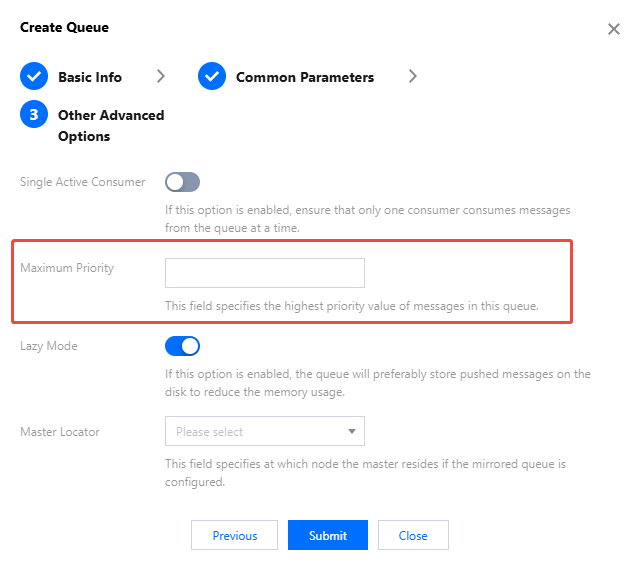After this parameter is configured, the priority feature is enabled. When sending messages, producers specify the priority level (between 0 and Maximum Priority) via the priority property. High-priority messages are consumed before lower-priority ones. The priority level of messages without a priority setting defaults to 0.