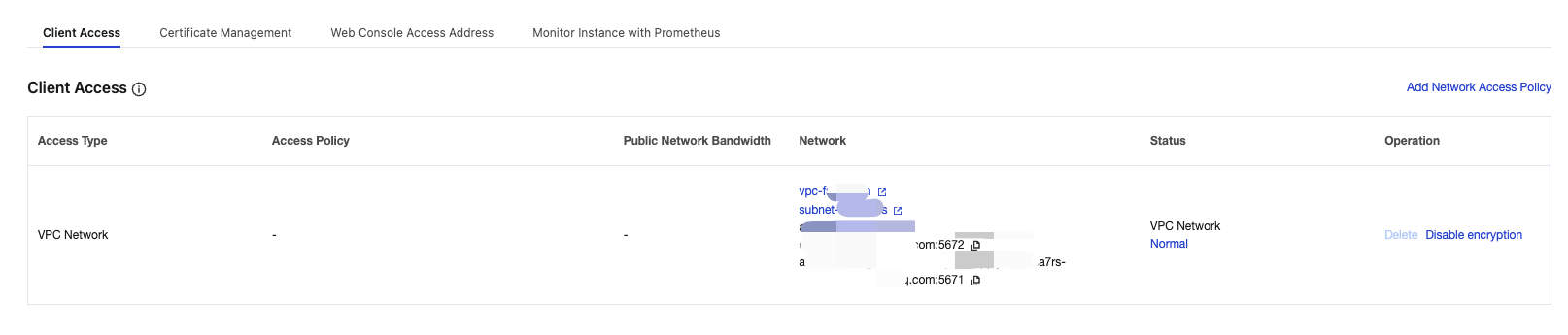 1. On the Certificate Management page, select the Client Access tab, click Convert IP to Domain in the Operation column of the target access point, and then click Confirm in the pop-up window. After conversion, an access point with port 5672 will be displayed in the Network column.