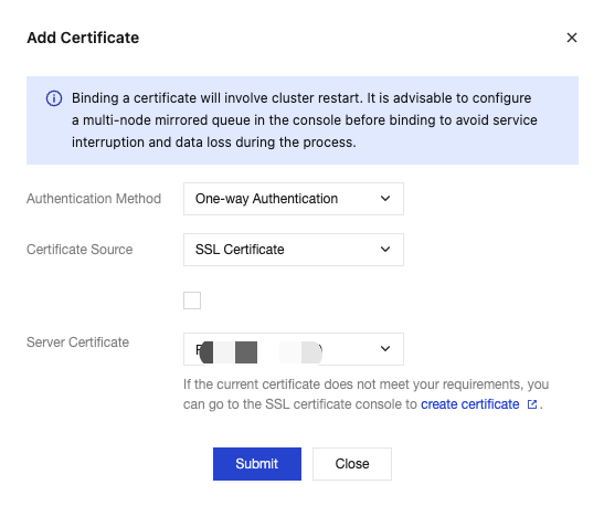 Certificate Source | Only SSL certificates managed by Tencent Cloud are supported. Note: If you are using the RabbitMQ TLS encryption feature for the first time, click Grant RabbitMQ Service Permission to Download and Apply SSL Certificate Functionality. |
