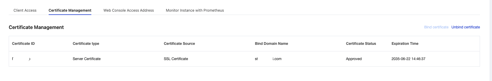 3. On the Basic Information page, select the Certificate Management tab and click Unbind Certificate in the upper-right corner.