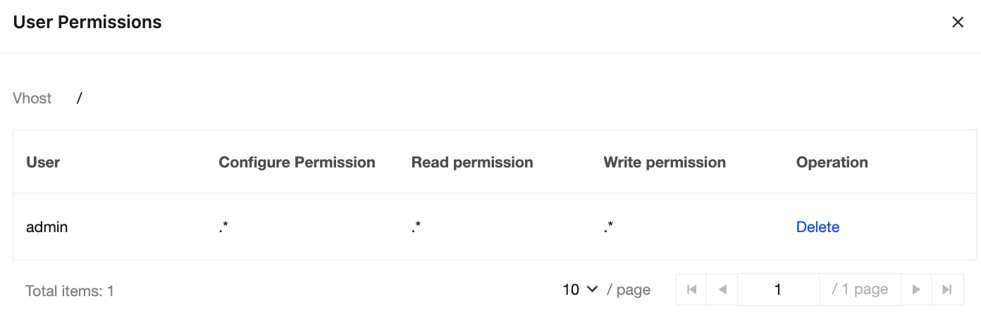 3. Click View User Permission in the Operation column of the vhost to view the user list and permission scope under this vhost. You can delete unnecessary user permissions based on actual needs.