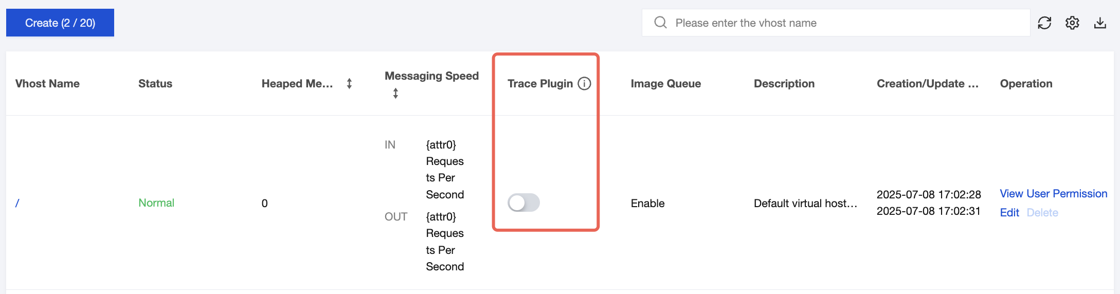 If you are using a Managed Edition cluster, you can enable or disable the Trace plugin toggle on the vhost list page to use the message query capability. It is recommended to use the Trace plugin for small-traffic validation/troubleshooting scenarios and not to enable it when cluster traffic exceeds 10,000 TPS. For details, see Querying Messages. If you are using a Serverless Edition cluster, the message query capability is supported by default, and no plugin configuration is required.