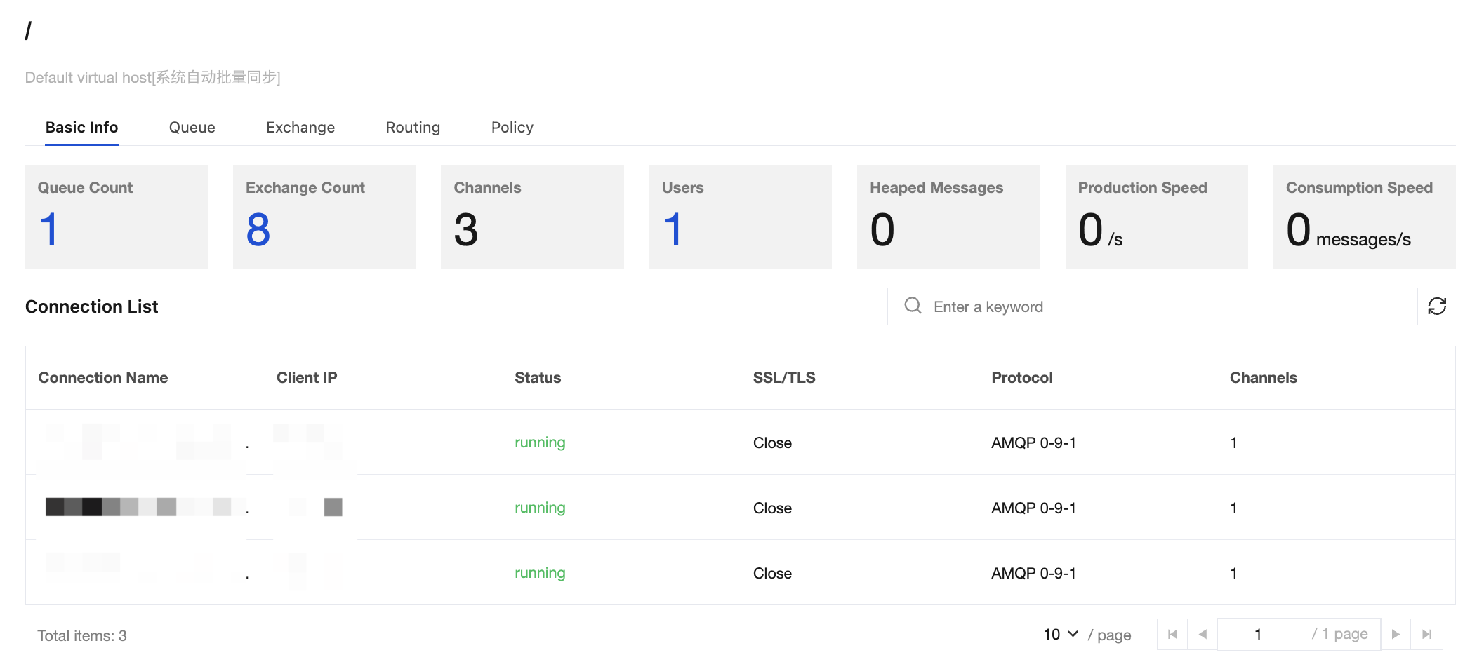 Connection List: displays the connection list information under the current vhost. You can use this information to monitor the client connection status in real time, check for abnormal connections (such as long-term idleness or frequent disconnections), and quickly locate the issues.