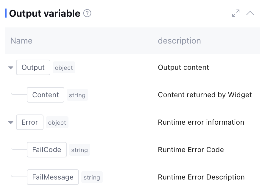 In the Widget Node, you need to complete the following configurations: Input Variable and Widget Issuance Method. These configurations determine the data source required for node execution and the circulation method of the process after execution, directly affecting the normal operation of node function and the effect of data interaction and visualization.