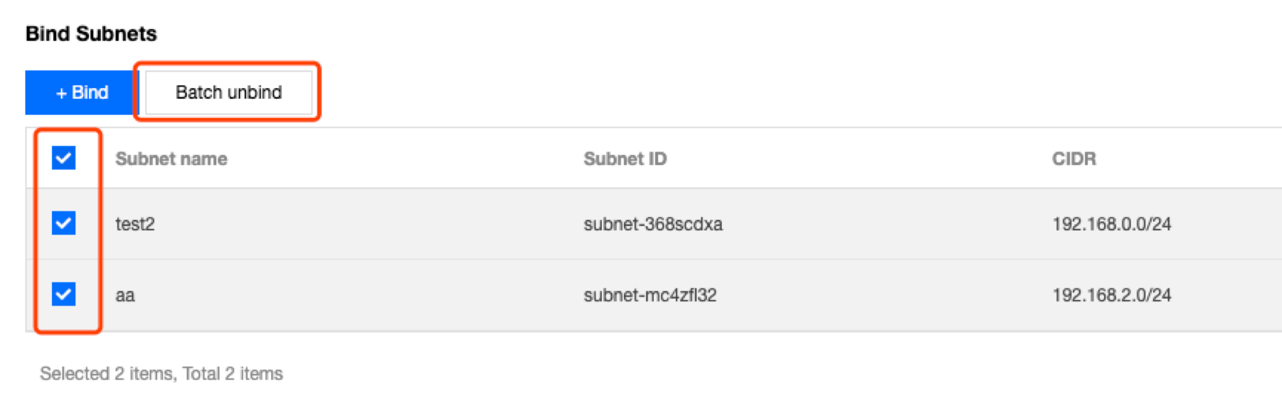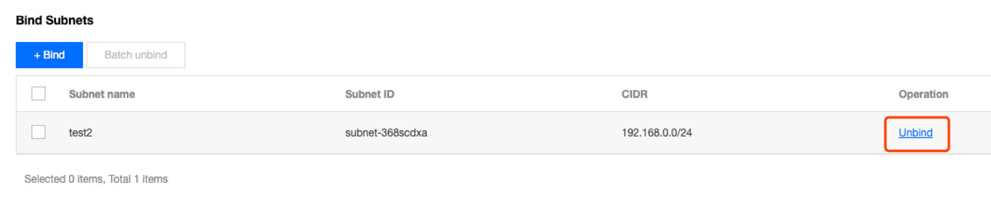 Metode 2: beri tanda centang di sebelah subnet yang akan diputus hubungannya dalam modul Associated Subnets (Subnet Terhubung) pada halaman Basic Information (Informasi Dasar), dan klik Batch Disassociate (Putus Hubungan Batch).