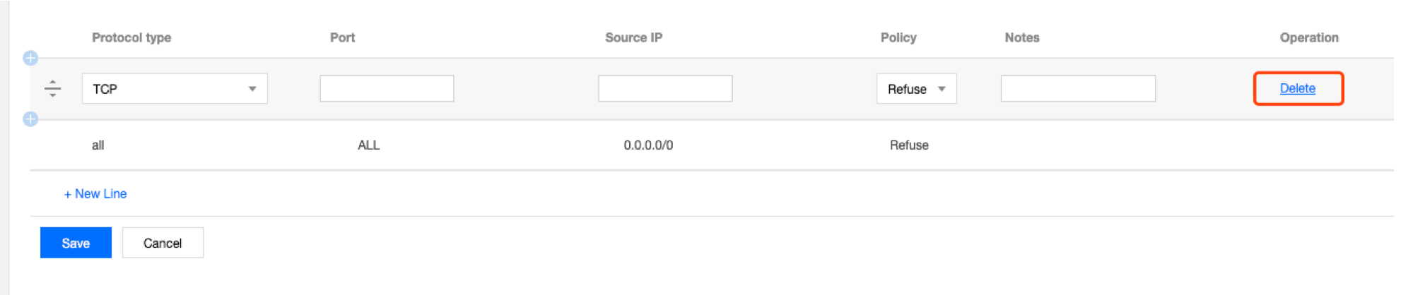 6. Dalam daftar, pilih baris aturan yang akan dihapus dan klik Delete (Hapus) di kolom operasi.
