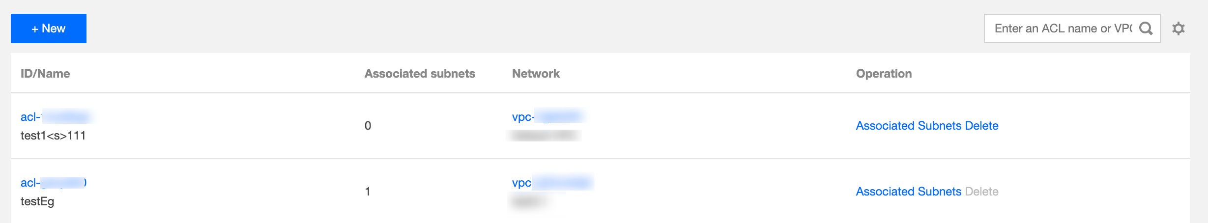 5. Pada halaman daftar, klik ID ACL yang sesuai untuk membuka halaman detailnya, tempat Anda dapat menambahkan aturan ACL dan menghubungkan aturan ACL dengan subnet.