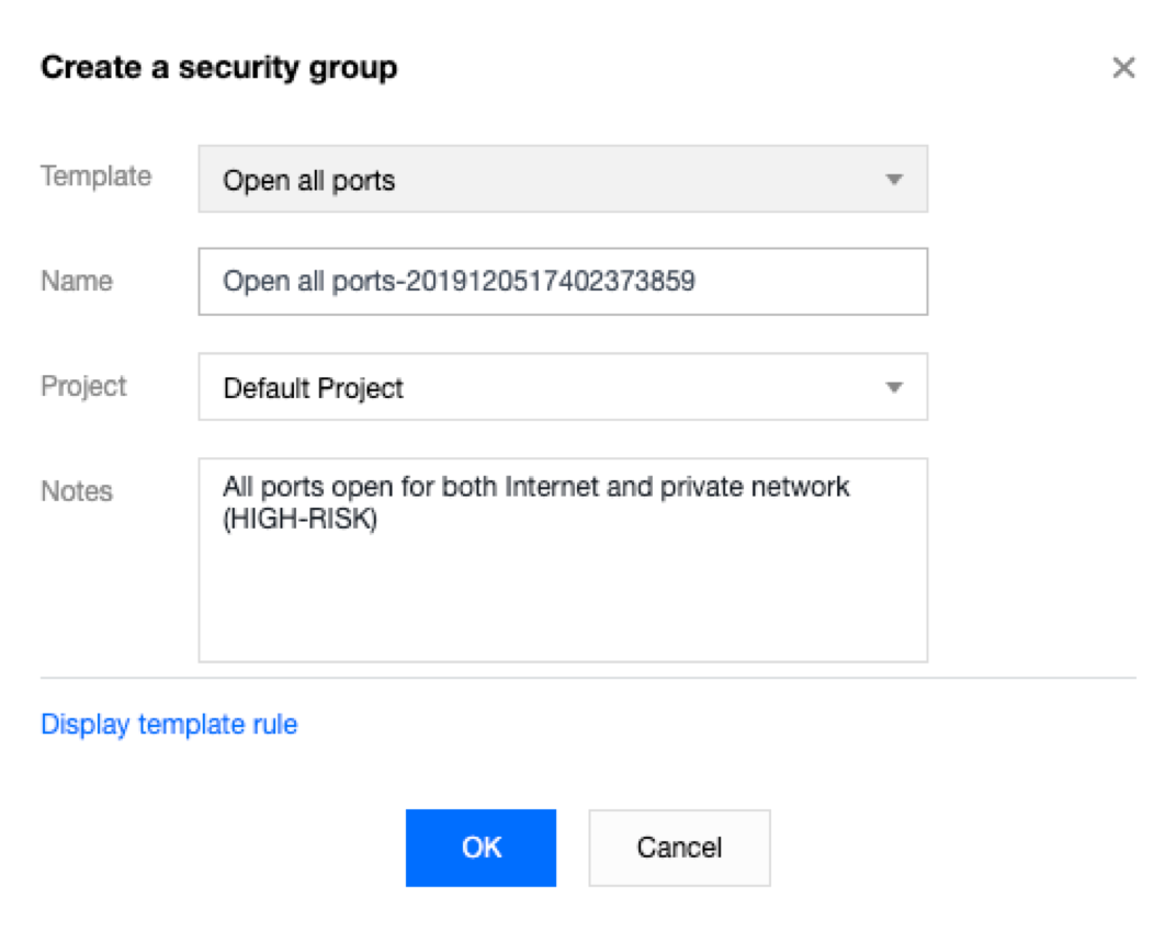Grup keamanan adalah firewall virtual untuk instans CVM. Setiap instans CVM harus dimasukkan dengan setidaknya satu grup keamanan. Tencent Cloud menyediakan dua templat: Open all ports to the Internet (Buka semua port ke internet) dan Open ports 22, 80, 443, and 3389 and ICMP protocol to the Internet (Buka port 22, 80, 443, dan 3389 serta protokol ICMP ke internet). Dengan templat ini, Anda dapat membuat grup keamanan default saat membuat instans CVM jika belum membuat grup keamanan.