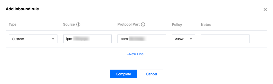 5. Di jendela pop-up, pilih jenis kustom, pilih templat parameter alamat IP yang sesuai untuk sumber/target, pilih templat parameter port protokol yang sesuai untuk port protokol tersebut, dan klik Complete (Selesai).