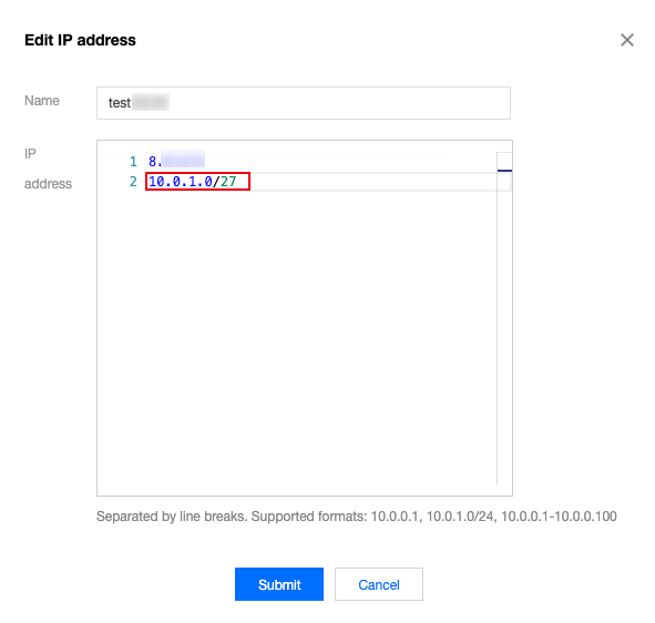 3. Di jendela pop-up, tambahkan rentang IP 10.0.1.0/27 di baris baru dan klik Submit (Kirim).