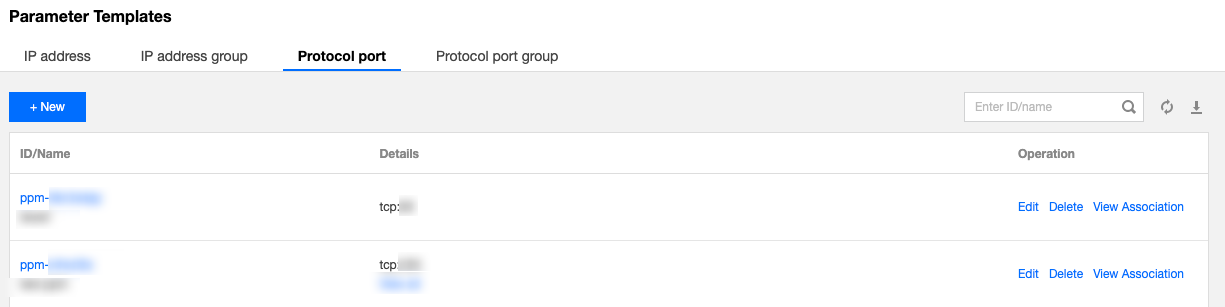 5. Pada tab Protocol Port (Port Protokol), klik + New (+Baru) untuk membuat templat parameter port protokol guna menambahkan aturan masuk dan keluar.
