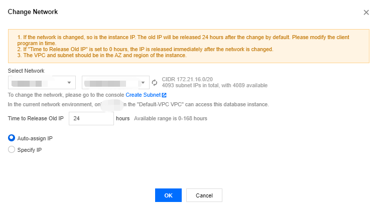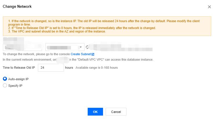 Mengalihkan jaringan dapat menyebabkan perubahan IP pribadi instans. IP asli akan menjadi tidak valid setelah waktu kepemilikan kembali berlalu. Harap segera modifikasi IP instans pada klien.