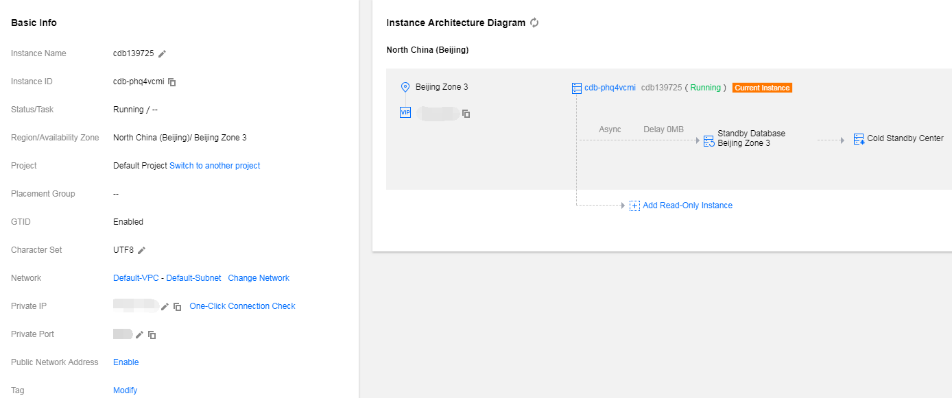 1. Login ke konsol TencentDB for MySQL. Dalam daftar instans, klik ID instans atau Manage (Kelola) di kolom Operation (Operasi) untuk masuk ke halaman detail instans. 2. Klik setelah Private Network Address (Alamat Jaringan Pribadi) dan Private Port (Port Pribadi) di bagian Basic Info (Info Dasar). Perhatian: