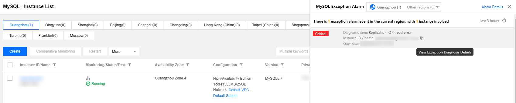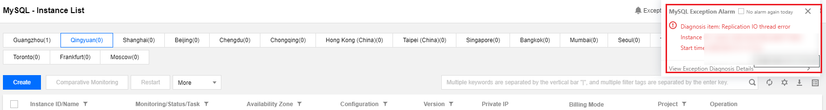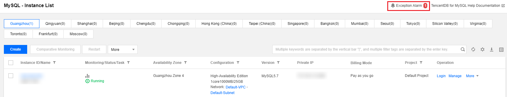 Login ke konsol TencentDB for MySQL, pilih Instance List (Daftar Instans), Task List (Daftar Tugas), Parameter Template (Templat Parameter), Recycle Bin (Keranjang Sampah) atau Placement Group (Grup Penempatan) pada bilah sisi kiri, dan klik Exception Alarm (Alarm Pengecualian) di sudut kanan atas untuk memperluas daftar pesan alarm pengecualian historis. Jumlah alarm yang dihasilkan dalam kasus di bawah akun Anda ditampilkan di sebelah tombol.