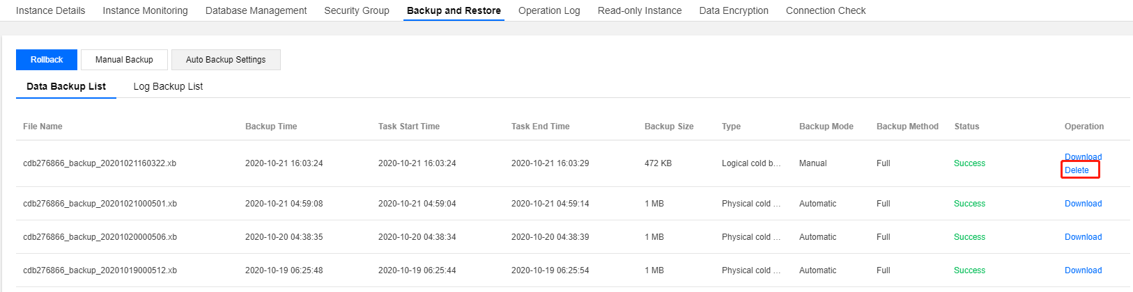 1. Login ke konsol TencentDB for MySQL. Dalam daftar instans, klik ID instans atau Manage (Kelola) di kolom "Operation" (Operasi) untuk mengakses halaman manajemen instans. 2. Pada tab Backup and Restore (Cadangkan dan Pulihkan), cari cadangan yang ingin Anda hapus di daftar cadangan, dan klik Delete (Hapus) di kolom "Operation" (Operasi).