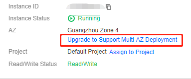 6. Di jendela Upgrade to Support Multi-AZ Deployment (Tingkatkan untuk Mendukung Deployment Multi-AZ), pelajari lebih lanjut tentang dampak peningkatan ke deployment multi-AZ, konfirmasikan apakah akan mendukung Membaca Node Lokal Saja, dan klik OK (OKE). 7. Instance Status (Status Instans) di Basic Info (Info Dasar) menjadi Upgrading to support multi-AZ deployment (Meningkatkan untuk mendukung deployment multi-AZ). Tunggu statusnya menjadi Running (Berjalan).