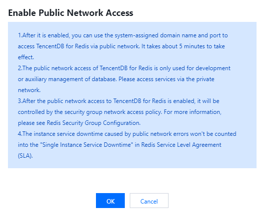 Akses jaringan publik akan merusak keamanan instans, dan ketersediaan layanan tidak dijamin oleh SLA. Oleh karena itu, sebaiknya akses Redis melalui jaringan publik hanya saat menguji, mengelola, atau membantu mengelola database. Di lingkungan produksi, akses Redis melalui jaringan pribadi.
