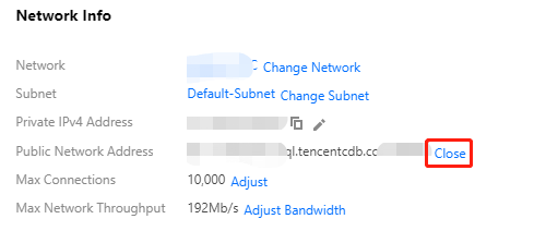 Setelah akses jaringan publik ke TencentDB for Redis diaktifkan, selanjutnya akan dikontrol oleh kebijakan grup keamanan. Untuk informasi selengkapnya, silakan lihat Mengonfigurasi Grup Keamanan. Menonaktifkan Alamat Jaringan Publik