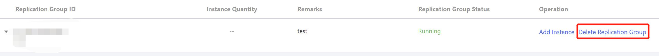 1. Di daftar grup replikasi, klik sebelum nama grup replikasi target untuk menampilkan daftar instansnya. 2. Temukan instans target dan klik Remove from Replication Group (Hapus dari Grup Replikasi) di kolom Operation (Operasi).