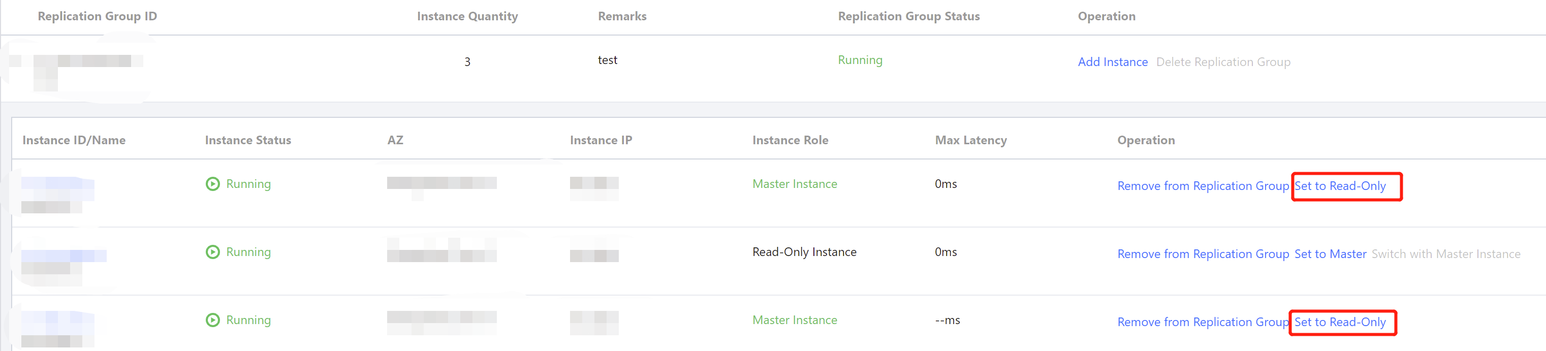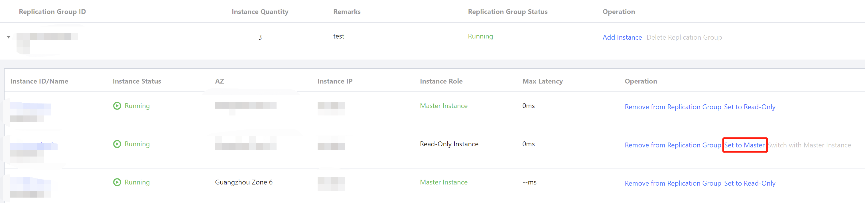 1. Di daftar grup replikasi, klik sebelum nama grup replikasi target untuk menampilkan daftar instansnya. 2. Temukan instans baca saja target dan klik Set to Master (Atur ke Master) di kolom Operation (Operasi).