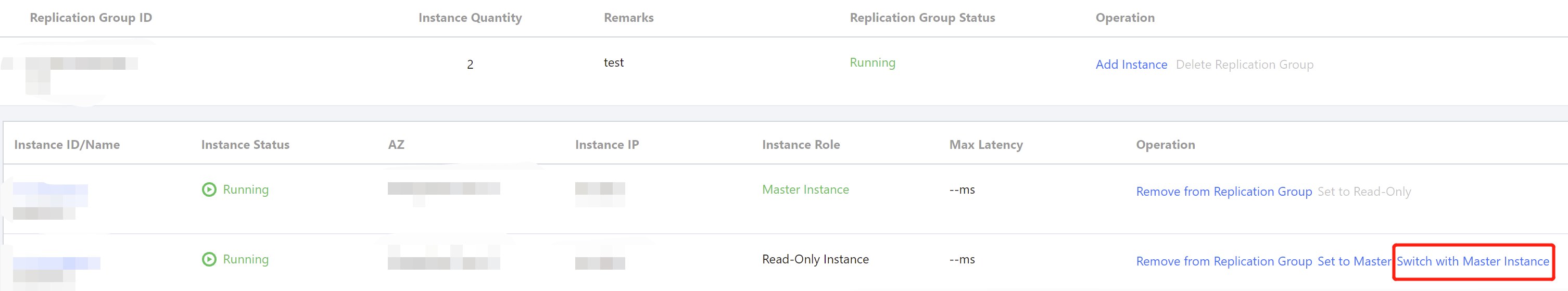 1. Di daftar grup replikasi, klik sebelum nama grup replikasi target untuk menampilkan daftar instansnya. 2. Temukan instans baca saja target dan klik Switch with Master Instance (Alihkan dengan Instans Master) di kolom Operation (Operasi).