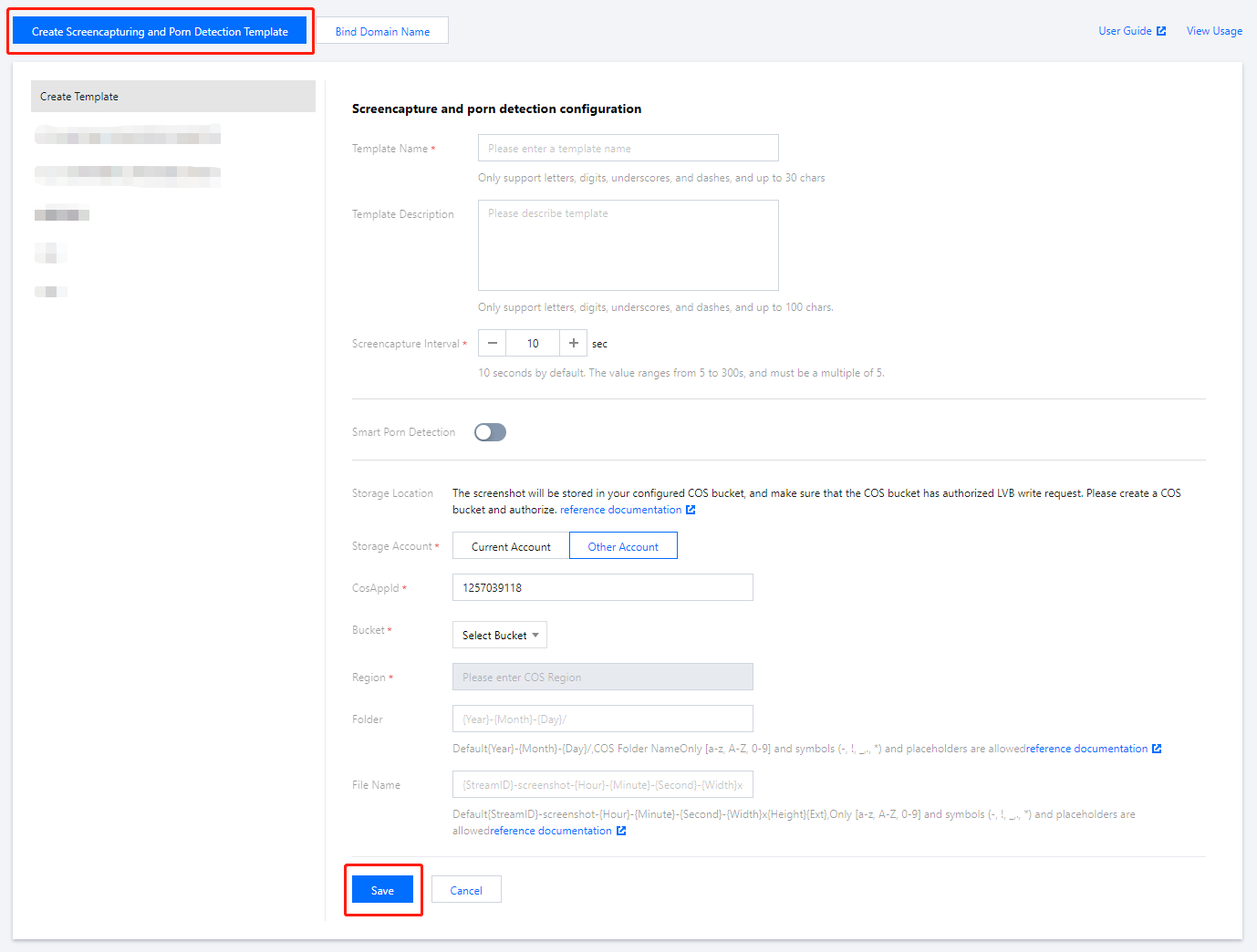 Template Name (Nama Templat) | Nama templat pengambilan tangkapan layar dan deteksi pornografi, yang dapat berisi hingga 30 huruf, angka, garis bawah (_), dan tanda hubung (-). |