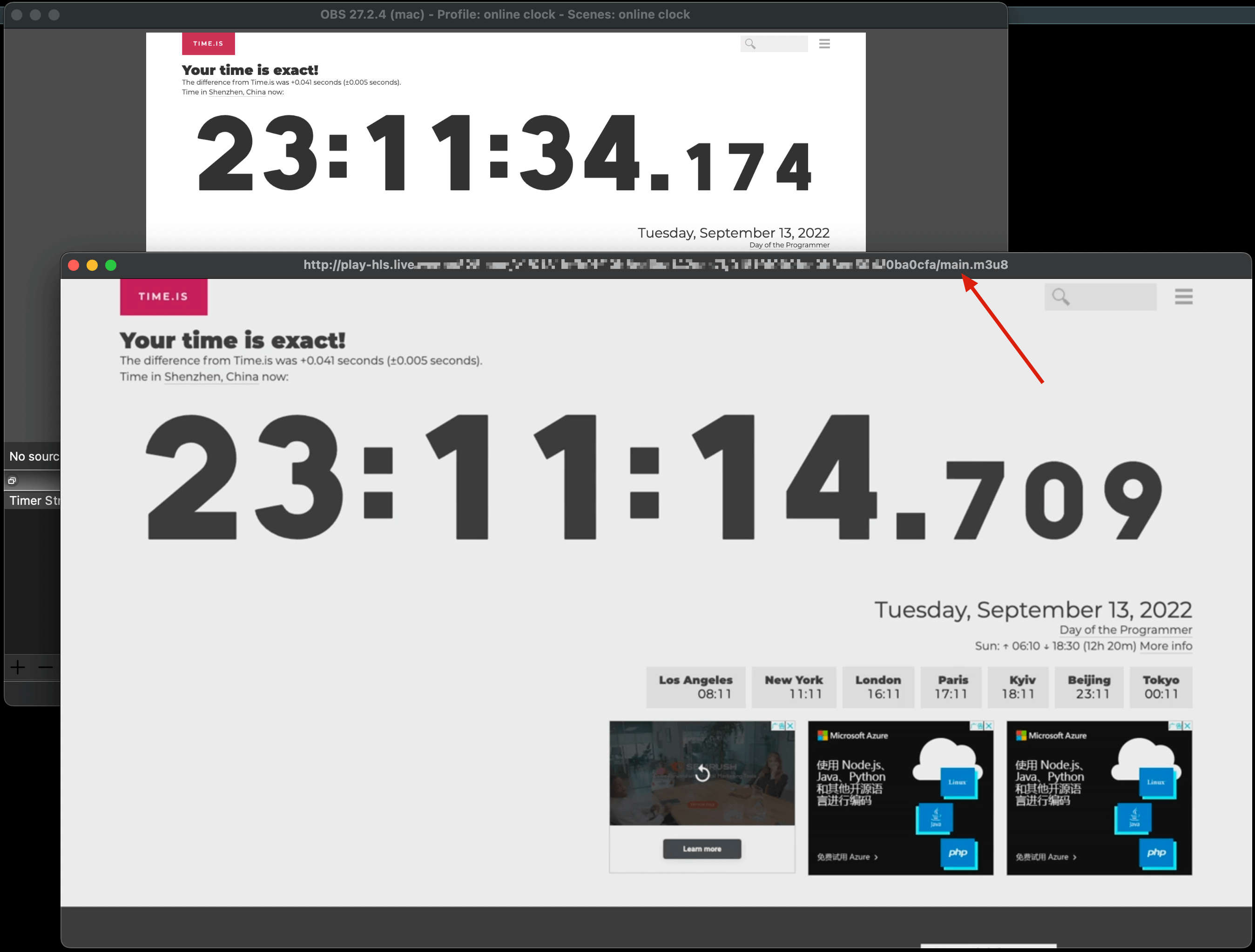 ここではOBS、VLCをプッシュおよび再生ツールとする場合を例とします。OBSのプッシュ設定でStreamLiveのInputプッシュアドレスを入力します。1行目のサーバーにはプッシュドメイン名+アプリケーション名を、2行目のストリームキーにはストリーム名をそれぞれ入力します。下の図をご参照ください。
