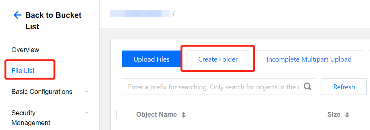 2. バケット名をクリックして設定画面に進み、ファイルリストページでフォルダの作成をクリックし、StreamLiveレコーディング機能のターゲットパスを作成し、レコーディングファイルの集中管理を行いやすくします。