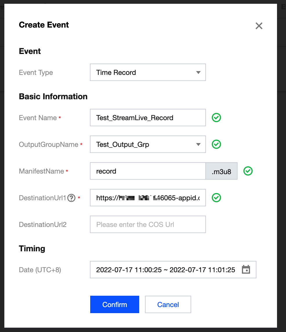 DestinationUrl1:入力の前に作成して記録した完全なCOSストレージパスであり、バケットドメイン名が含まれます。
