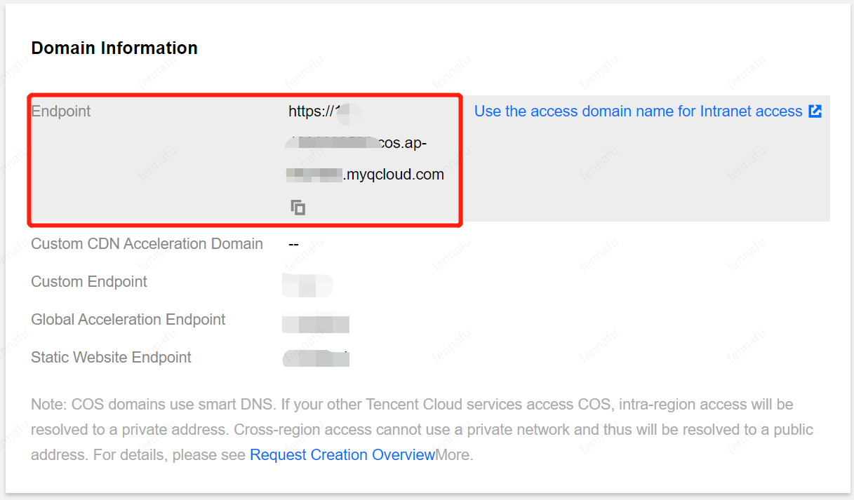 所属するバケットのアクセスドメイン名は、バケットの概要ページのドメイン名情報ボックスで照会できます。