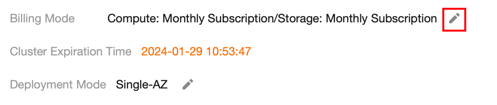 クラスタのコンピューティングノード課金モードが従量課金である場合、ストレージ課金モードは従量課金のみ選択可能です。クラスタのコンピューティングノード課金モードが年/月単位サブスクリプションである場合、ストレージ課金モードは従量課金から年/月単位サブスクリプションへの変更がサポートされます。クラスタ管理ページ > 課金モード > ストレージで、編集アイコンをクリックします。