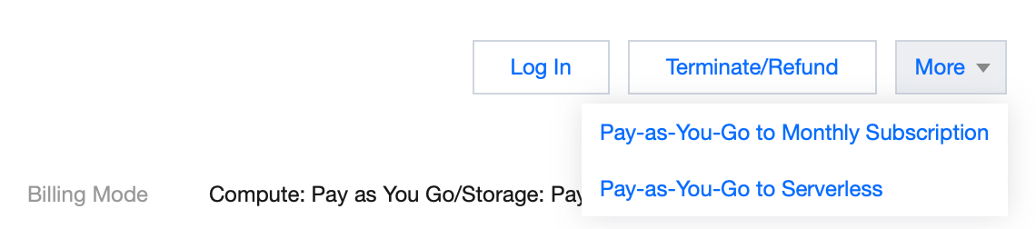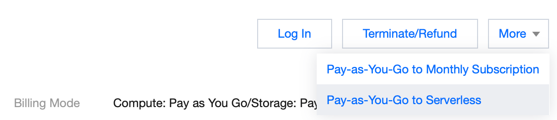 クラスタのコンピューティングノード課金モードが年/月単位サブスクリプションの場合、計算ノードは他の課金モードへの変更をサポートしていません。クラスタがマルチAZデプロイを採用している場合、コンピューティングノード課金モードの従量課金からServerlessへの変更はサポートされていません。クラスタ管理ページで、その他 > 従量課金からServerlessに変更をクリックします。