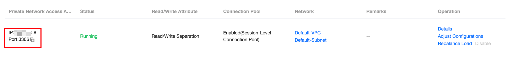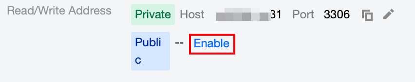 クラスタ詳細ページで、対象インスタンスを見つけ、リードライトアドレスまたはリードオンリーアドレスの外部ネットワークの横にある有効化をクリックします。