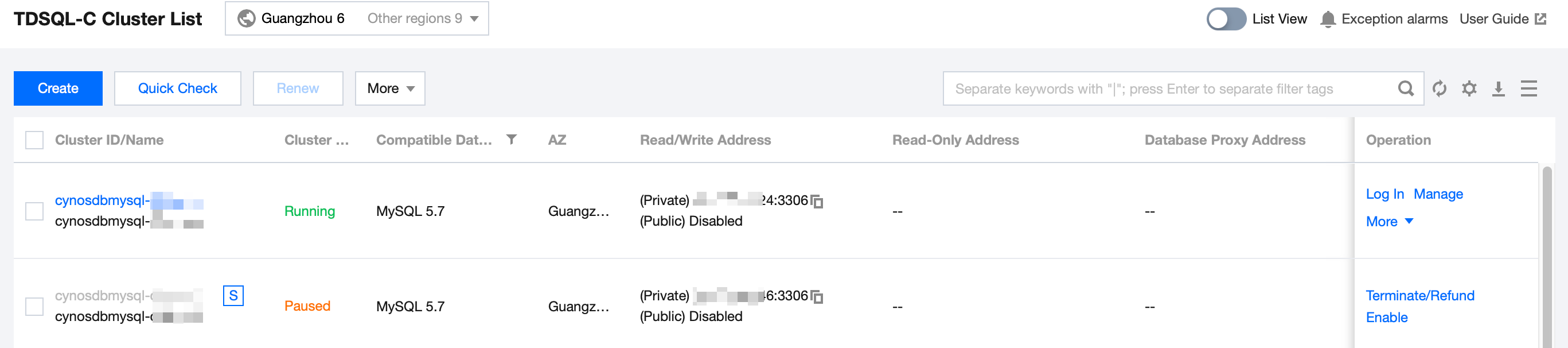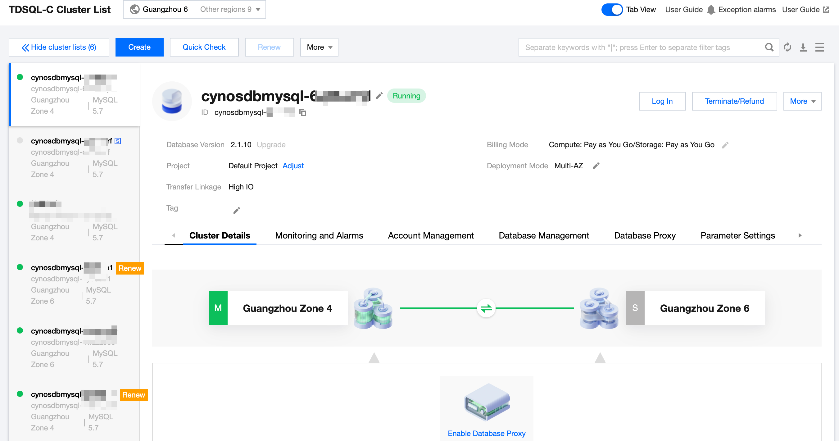 TDSQL-C for MySQLは新バージョンのコンソールをリリースし、タブビューをサポートしています。旧バージョンのリストビューと比べて、使いやすさ、美観、効率性が効果的に向上しました。Tencent Cloudは新バージョンコンソールの使用を推奨します。クラスタを確認するためのより明確なビュー情報を提供し、クラスタをより効率的かつ便利に管理できます。