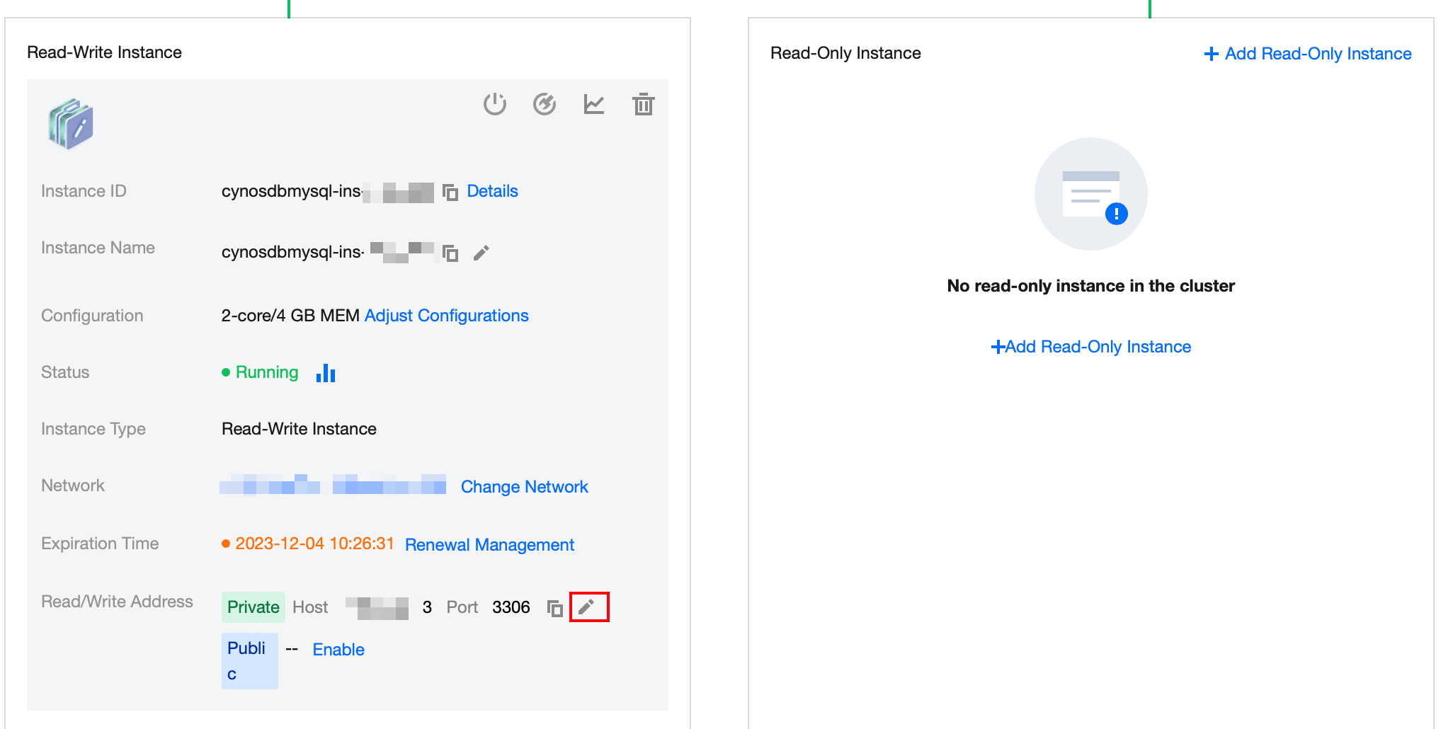 4. クラスタ管理ページ > クラスタ詳細ページで対象インスタンス(読み書きインスタンスまたは読み取り専用インスタンス)を見つけ、その読み書きアドレスまたは読み取り専用アドレスの横にある編集アイコンをクリックします。