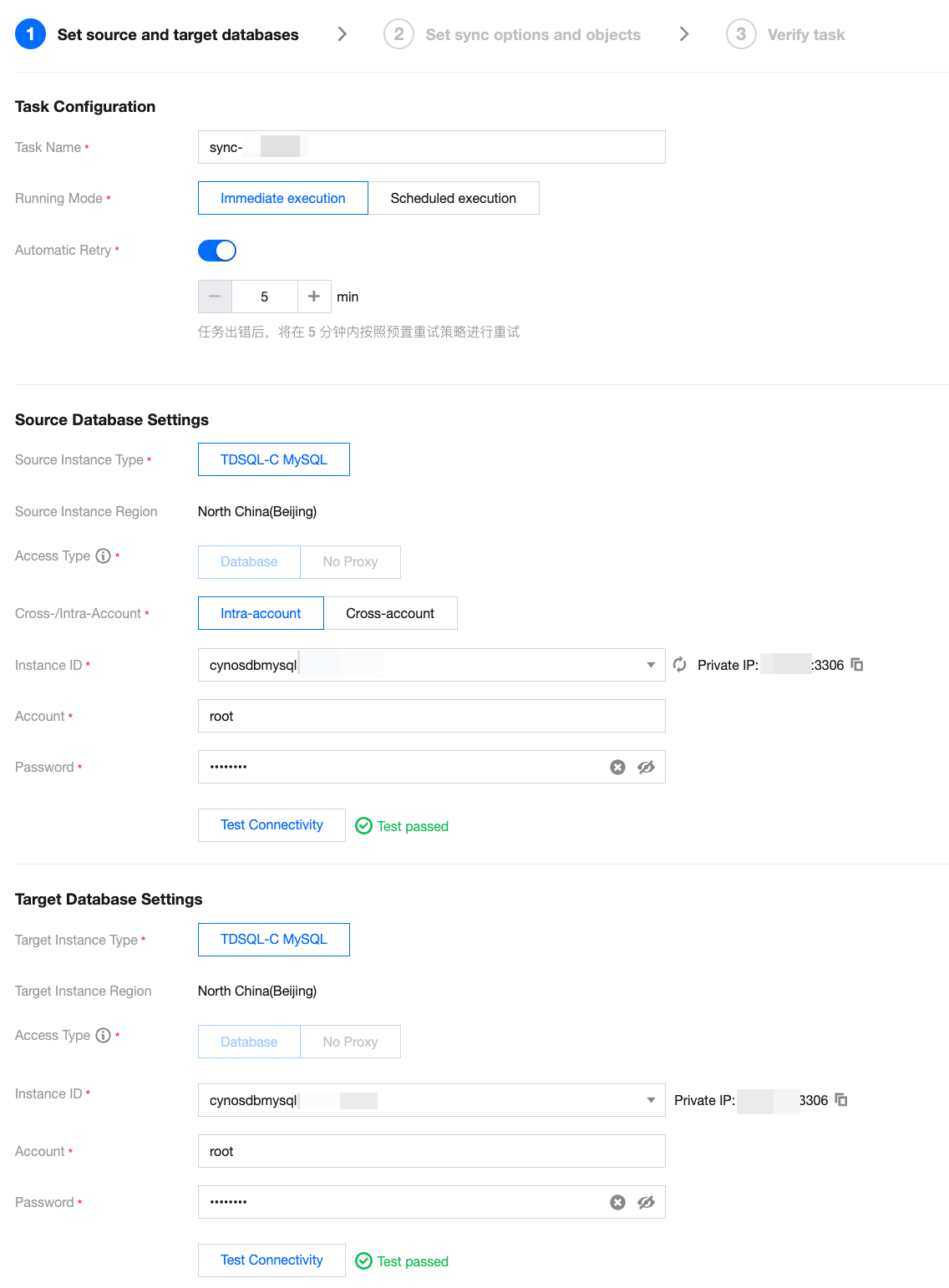 4. 同期タスク設定ページで、ソースインスタンス、アカウントとパスワードを設定し、ターゲットインスタンス、アカウントとパスワードを設定し、接続テストを実行した後、次へをクリックします。